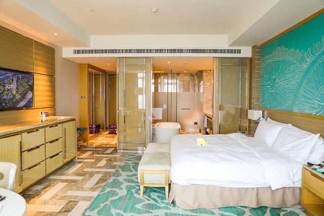 房间里最大的亮点无疑是这块IMAX巨幕全海景玻璃窗,全景窗户从房间一端延伸至另一端,哪怕赖在房间里也能分分钟享受海景大片。