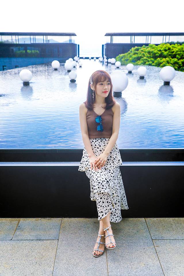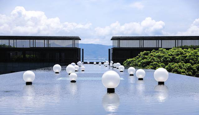 酒店又一处出片极佳的地方,位于check in大堂外标志性的水景平台。水平如镜的池面上,大大小小洁白的圆形灯球如珍珠般一颗颗散落之上,玲珑剔透,唯美梦幻又不失典雅大气。水景平台一路延伸,引领你的视线望向远处广袤的海景。