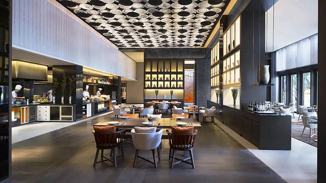 清晨,穿过鸟语花香的连廊,窗外绿意满园,阳光透过大落地窗洒在树叶上投射进来,满地光影婆娑,如梦如幻。从我们住的那栋楼到餐厅需要步行一段路,但这一路丝毫不觉乏味,反倒充满新奇,无论是空间设计、光影运用、色调搭配,还是随处摆放的艺术品,酒店处处让人惊艳却给人一种低调奢华之感。