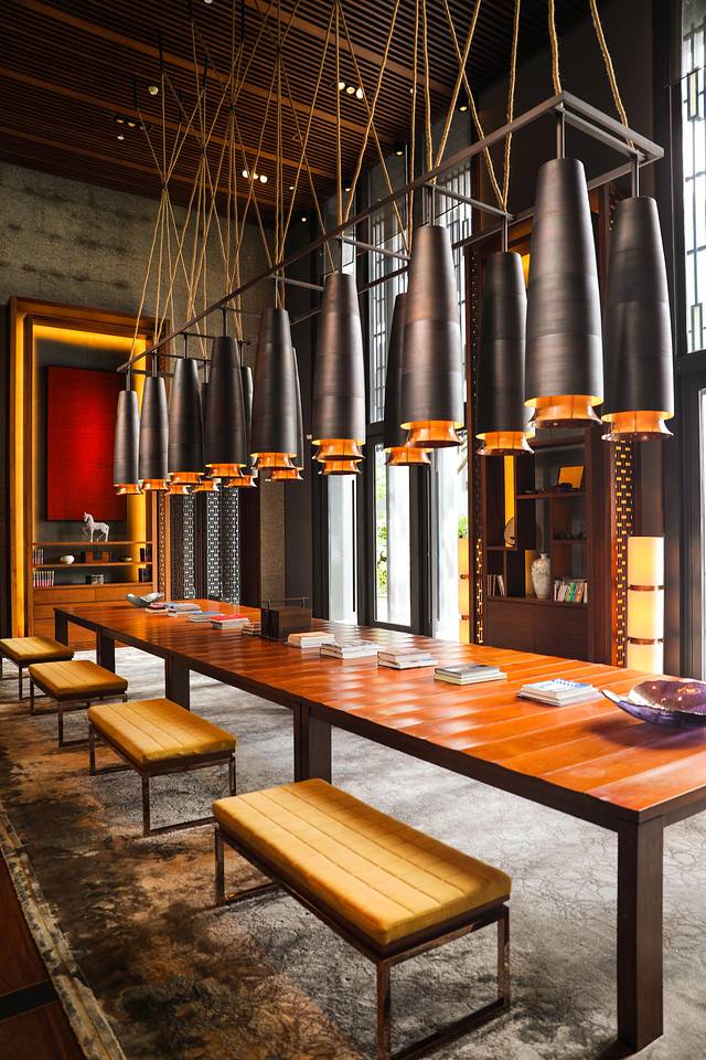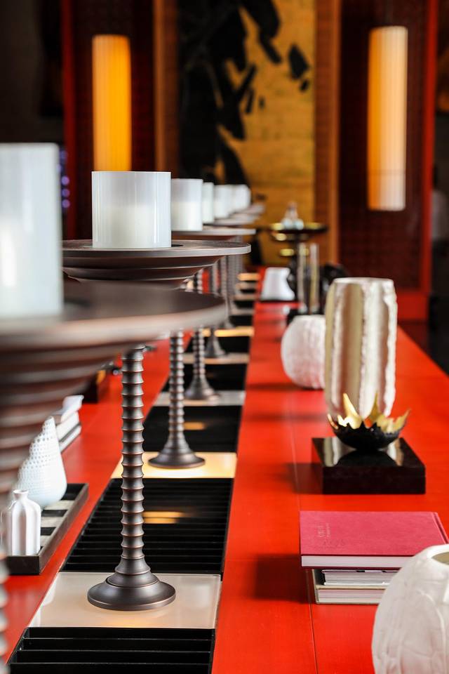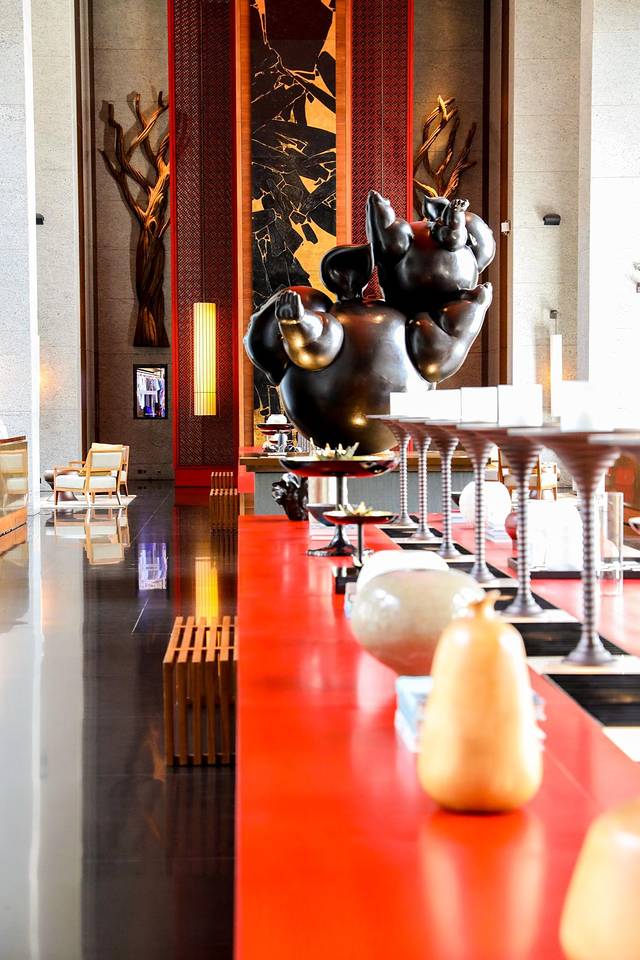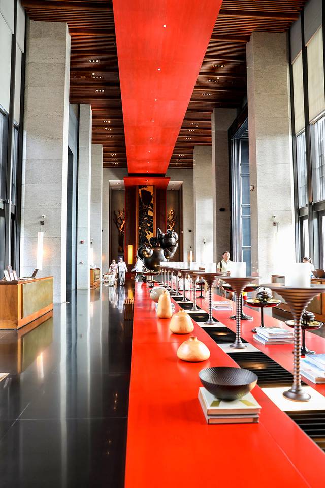 穿过走廊,瞬间置身于一个四层楼挑高、视野宽阔的空间里,这里便是酒店大堂。大堂中央同样摆放着大红色的长条形方桌,与屋顶的红色长条装饰相呼应。方桌上陈列的各式烛台和艺术品愈发弥漫着艺术气息,整个大堂被落地窗外洒进来的阳光照得明亮通透。