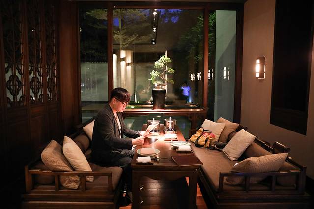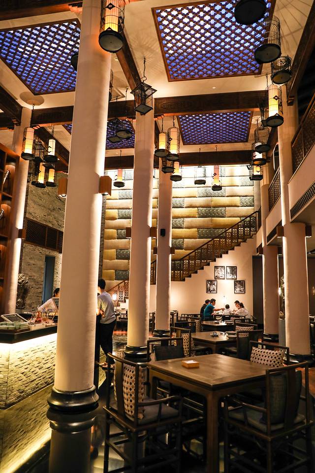 要说“茶苑”,令我惊艳的何止餐厅的品质,踏入“茶苑”那一刻,仿佛来到一户江南小宅,也顾不得点菜了,站那儿傻傻环视四周了好几圈。传统的中式陶瓷瓦顶设计,内有阁楼,外享庭院,仿佛置身江南园林中。层高9米的天花板上悬挂着成串鸟笼,墙上排满了各式酒缸,别具特色。茶苑午餐提供健康轻食午餐,例如广式点心、面食以及海南本地特色,晚餐主打美味火锅。