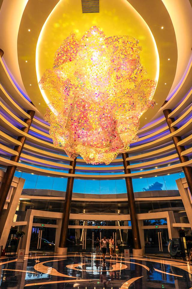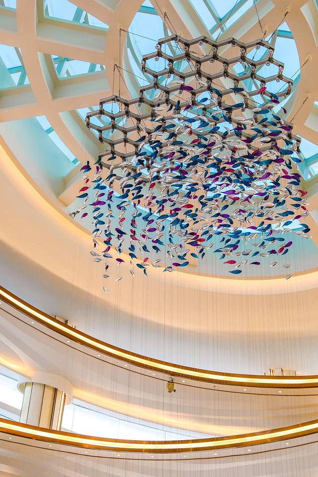 傍晚的时候,老公似乎有些过意不去便陪我到酒店里逛逛。相比房间,酒店大堂的设计我很喜欢,白色的透明穹顶垂下色彩斑斓的小鱼吊灯,大气又不失趣味,充满灵动感。