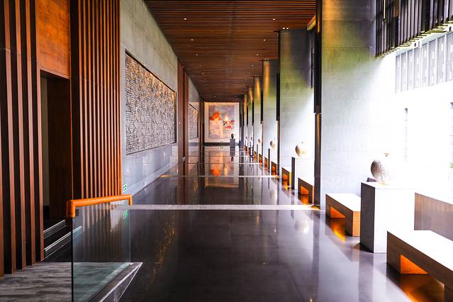 正是酒店里众多的连廊,串联起了酒店这六栋依山而建错落有致的大楼。而这一条条悠长的连廊无疑又是酒店的一大亮点。在连廊漫步,时而仿佛穿越一座艺术宫殿,时而又仿佛穿越一条时空隧道。走着走着不禁会迷失其中,这究竟是博物馆?是画廊?是艺术宫?还是酒店?来,跟着我一起迷失在这低调奢华的艺术宫殿~
