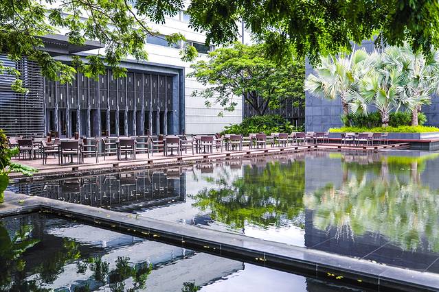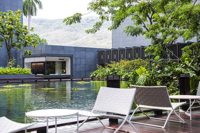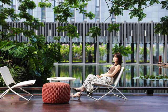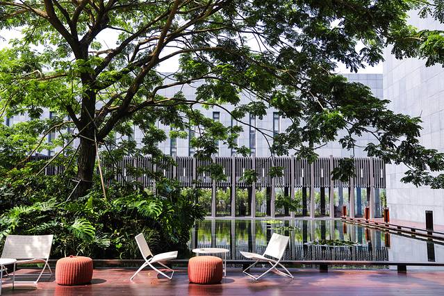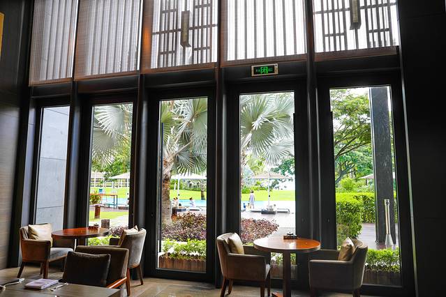 这是酒店另一片我们非常喜欢的景观,一池碧水在阳光照耀下波光粼粼,池塘里始终有工作人员悉心养护,四面古树参天,绿意葱茏,好一派江南水乡悠然自得的景致,找一个位子坐下静静感受这番闲适恬静。