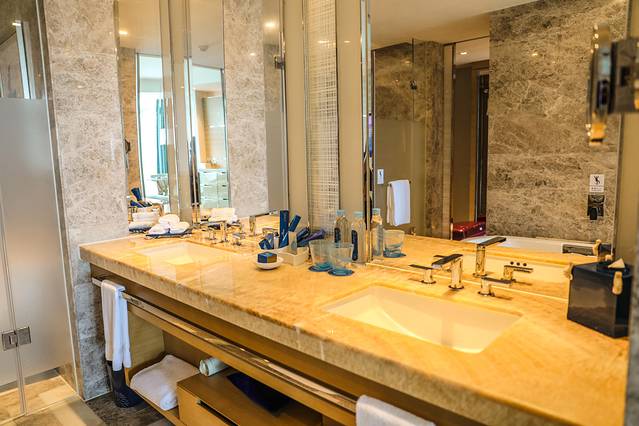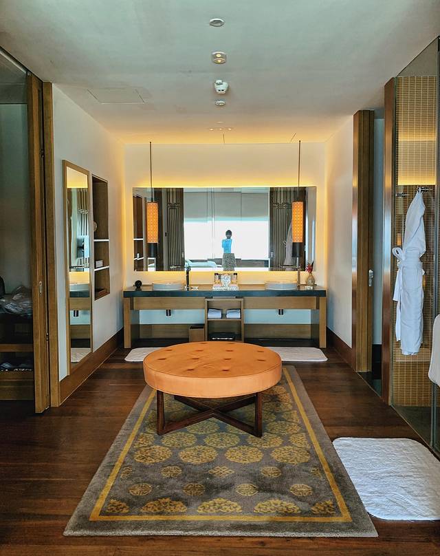 超大的盥洗室里,宽敞的双人洗手台,左手边是步入式衣帽间,美美哒度假裙都可以挂在里头井井有条,就连28寸大行李箱也可以妥妥地放置在里头;右手边则是干湿分离区域,还有中间的大圆凳简直是我这种东西超多星人的福音爱心小蜂。要说最爱的一定是它家的TOTO全自动智能马桶了,步入卫生间马桶便会自动感应打开,整个过程你只需负责穿脱裤子即可偷笑小蚂。