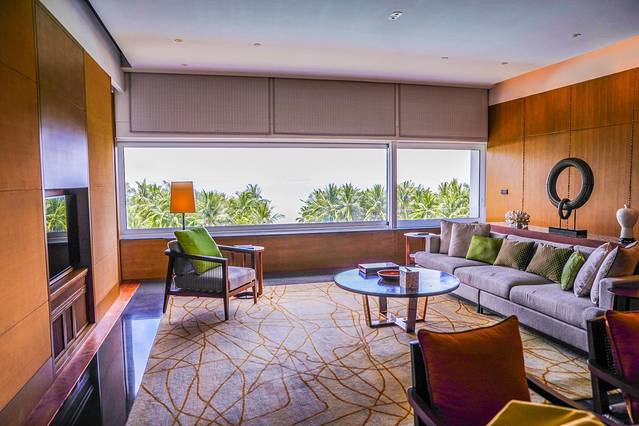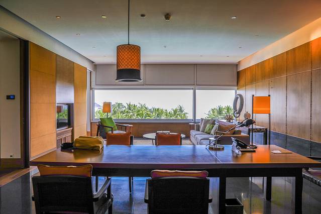 这便是五楼套房窗户望出去的风景,正如我所料,高耸的椰子树遮挡了一大半的海岸线。于是马上电话前台,酒店经查询后让我们等待片刻,稍后会有服务生带我们去另一间高楼层的房间。