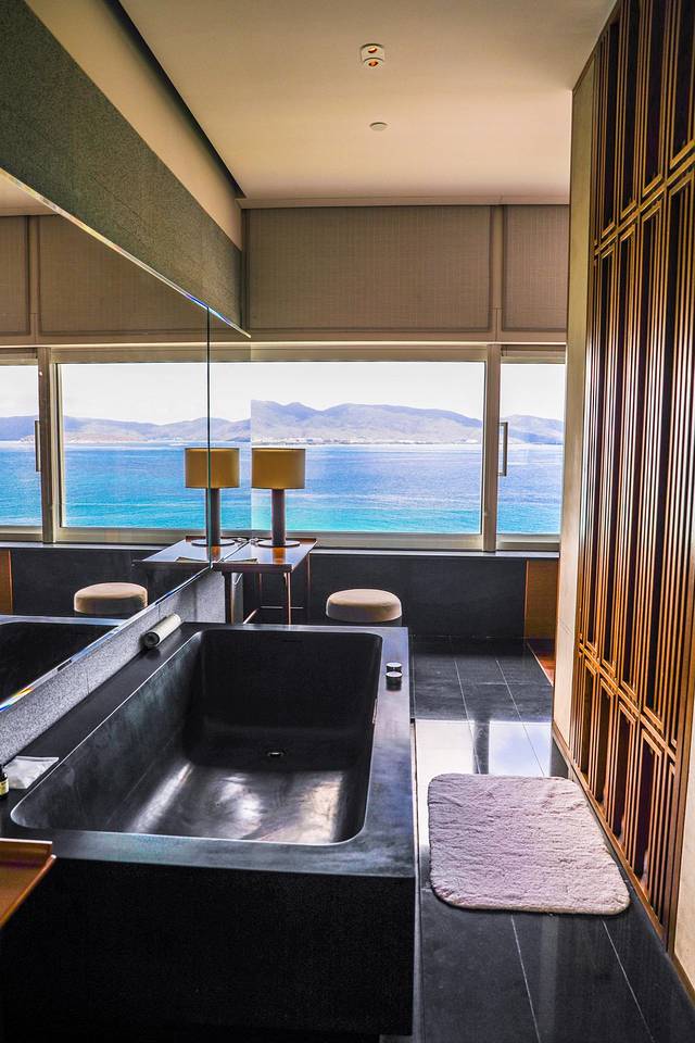黑色大理石浴缸被放置在房间里,和卧室间做了部分隔断,卧室里的全景窗一路延伸过来,边泡澡边可以美滋滋地欣赏海景。