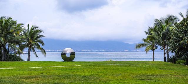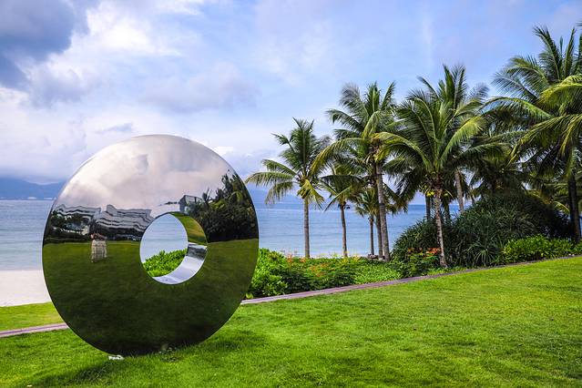 酒店里很多处都可以看到这样圆环形的装饰物,似乎是柏悦的标志性logo?寓意便不得而知了。这个立在海边的不锈钢小圆环看似普通,实则起到了点睛之笔。