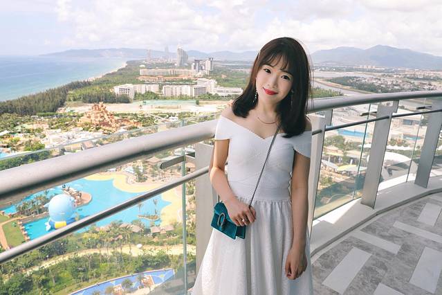 52楼的视野果然好很多,海棠湾整个海岸线尽收眼底,远处海中央的那座岛便是蜈支洲岛。下图左下方位的绿色草坪就是傍晚举办婚礼仪式的场地,现场仍在布置中。