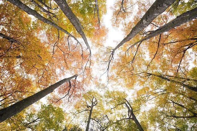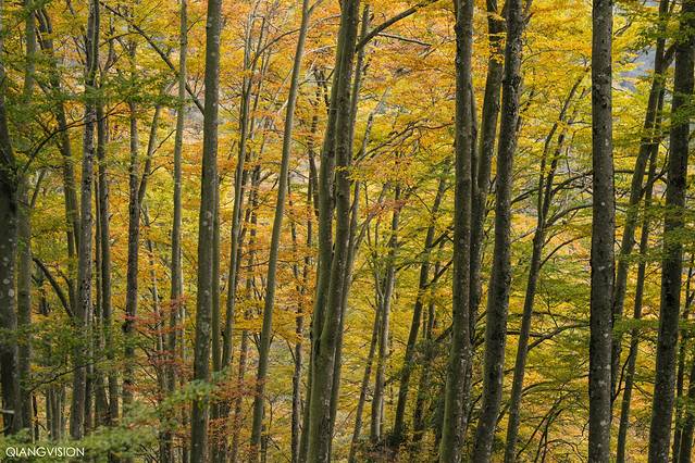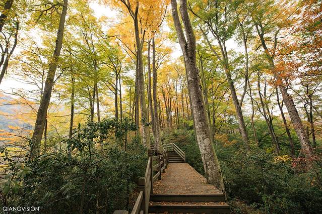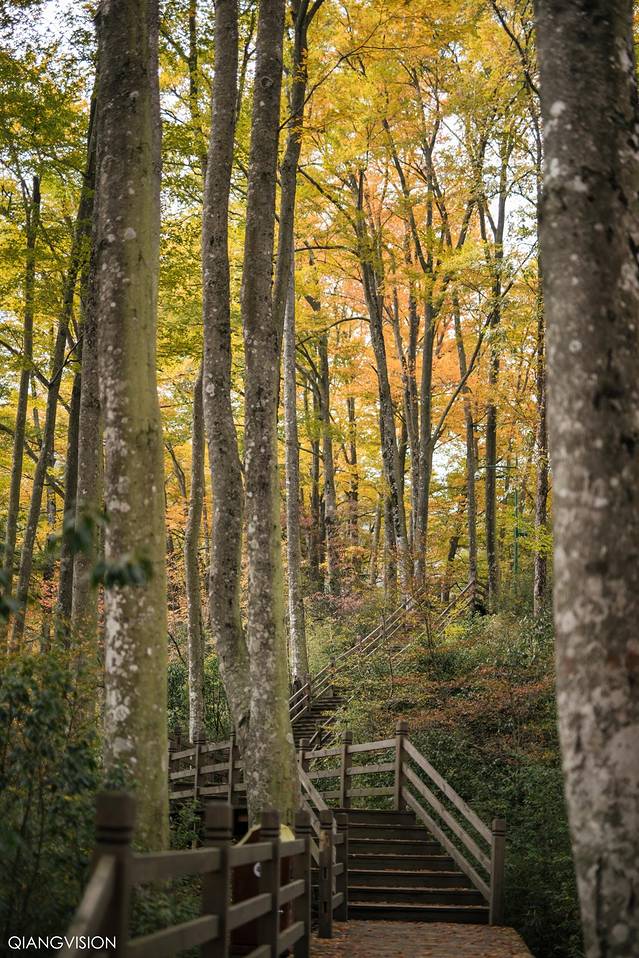步入画廊栈道,真的就如同走进了一副优美的画卷之中,纵横交错的的巴山水青冈,笔直的伸向天空,婷婷玉立的身子骨,在五彩斑斓的彩叶映衬下,张扬而妩媚!