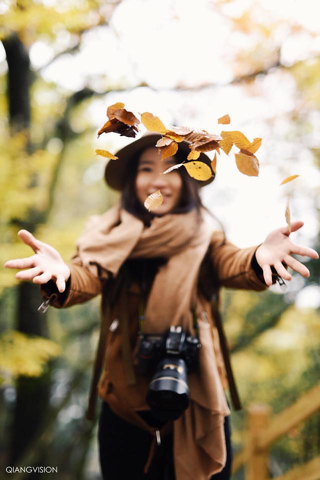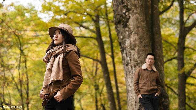 拍摄秋景人像,最好用的是定焦大光圈的镜头,其中我们最常用的是50 1.4和85 1.4,大光圈的虚化效果,在光影斑驳的树林中最方便使用。