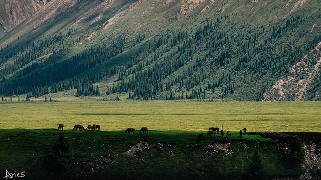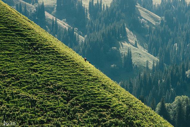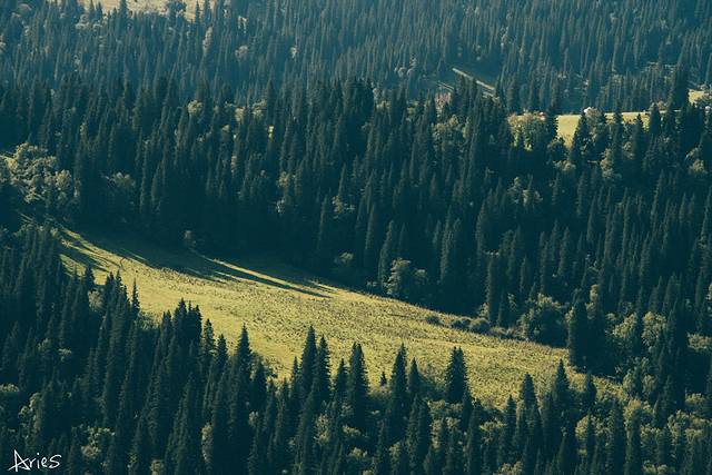 雪山脚下,冰洞融化,孕育了林海和牧场,在最接近天空的地方,形成一条垂直景观带。