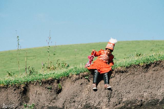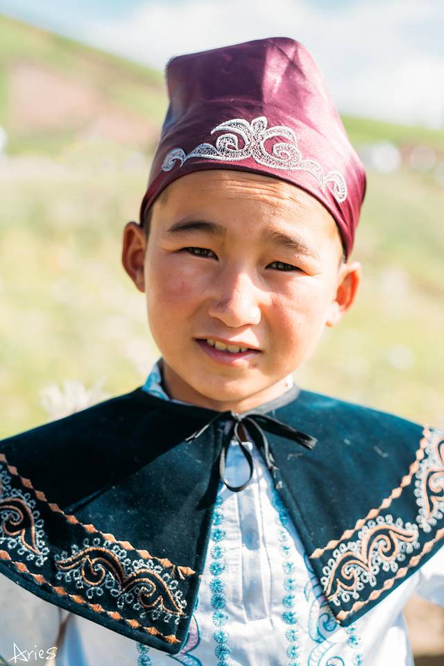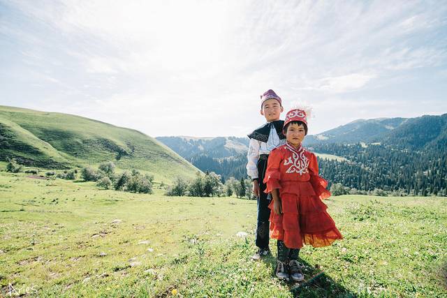 远方草坡上一个小姑娘吸引了注意,她穿着粉色的花裙,带着一把小花伞,哥哥牵着妹妹带着花儿一般的微笑朝我们走来,“姐姐,喝马奶吗?”