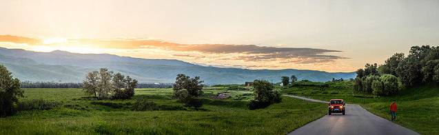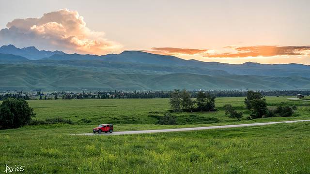 美丽的夕阳慢慢坠下,一霎那仿佛所有一切都进入了静止状态,我们在金色的夕阳下抵达那拉提草原。