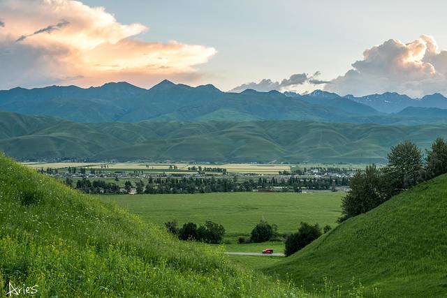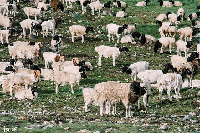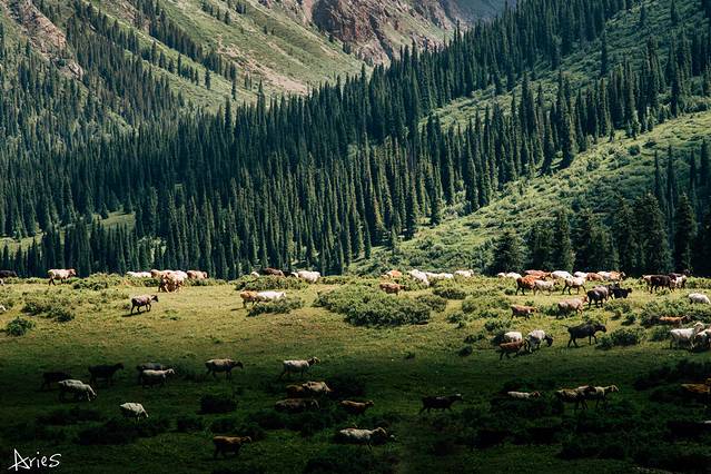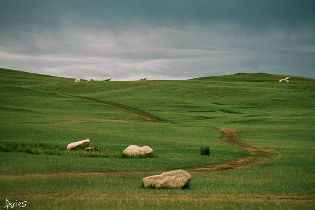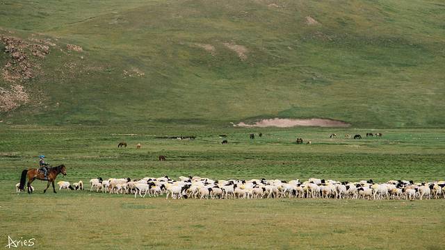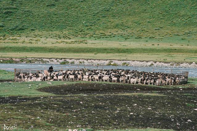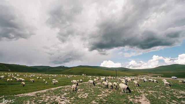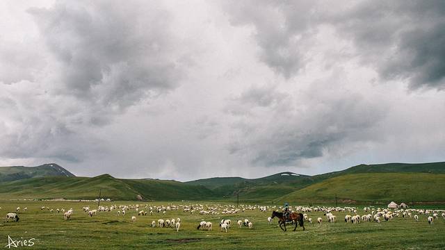 海拔攀升,松林又渐渐消失了踪迹,取而代之的草原地貌像极了四川地区的若尔盖大草原,笔直的公路两旁是大片的牧场,密密麻麻的羊群在悠闲地吃草,小男孩骑在高大的马匹上和爸爸配合熟练的赶羊。