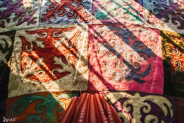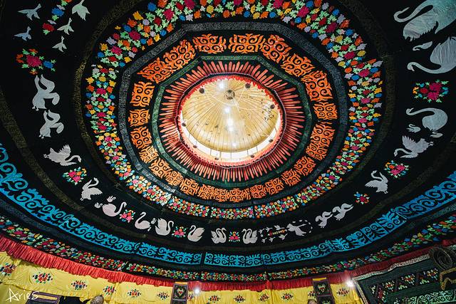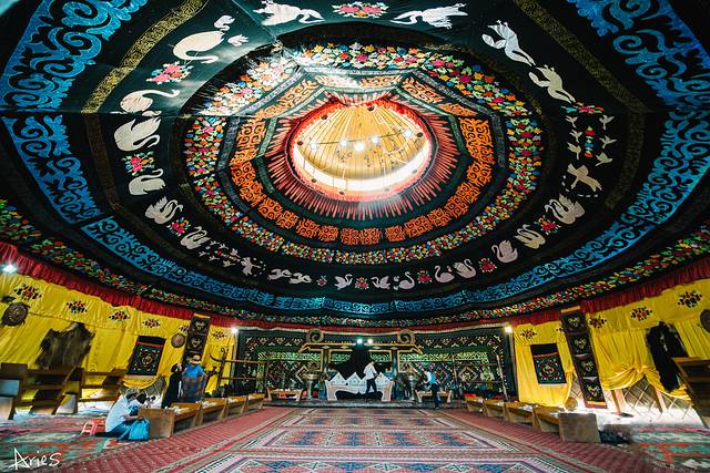 准确来说这是哈萨克的毡房,不同于我们常见的蒙古包,在形状、结构、 材料等方面虽然比较相似,但是但它们的各种图案颜色细节都包含了特定的民俗特征。