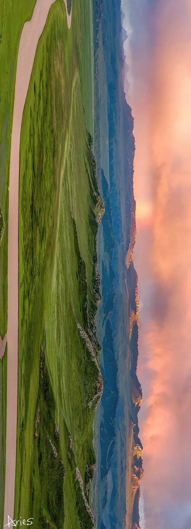 很快天边的云朵在朝霞里燃烧,墨绿色的草原上漂浮起淡淡的薄雾,染着一抹红,透着一缕金,天地间透着浑然一体的玫红色,宛若仙境。