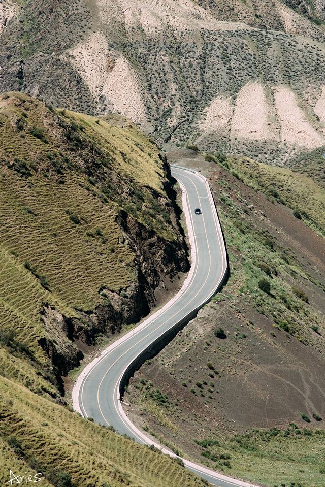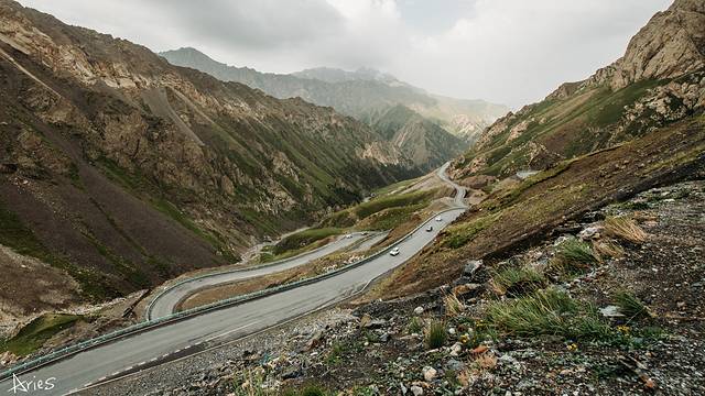 穿越天山山脉中部的山间盆地,再次翻越雪山垭口,向南疆的城市库车前行,蜿蜒盘旋险峻的山路再次出现,好在天气状况良好,通过毫无压力。