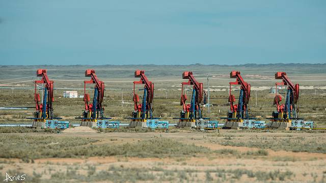 正午炙热的戈壁滩上,排列整齐一刻不停的“磕头机”辛勤的工作着,每一点头,意味着对自然资源的攫取,同时也象征着自然给人类的恩施。它们更像坚守边疆的战士,夜以继日的开采着现代工业的血液。