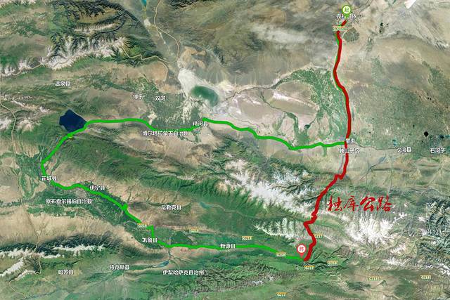 在新疆天山是一道天然屏障,横亘在南疆和北疆之间,它不仅隔出了两片大地,也隔出了完全不同的自然风景、民族和风俗。曾经人们想要从北疆到南疆,必须绕道靠东一点的乌鲁木齐。下图绿色的线路,连接新疆的独山子到库车,全程大约859公里。