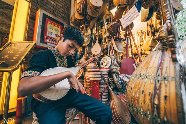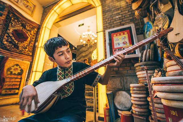 小男孩正在弹奏冬不拉,尽管围观的人挺多,将他的小脸衬得绯红,可他丝毫不受干扰,似乎很享受音乐从指尖流出的过程。