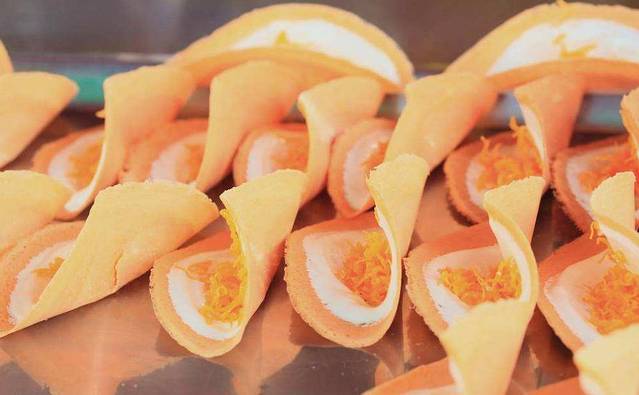 泰国大嫂超利落的用面糊先浇在铁板上,然后放上椰奶味的内馅还有一些蔬菜丝,最后用铲子趁热卷起来,外皮酥脆咔嚓咔嚓,加上椰奶的味道很清爽甜美,感觉自己都变得萌萌哒。