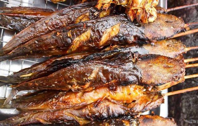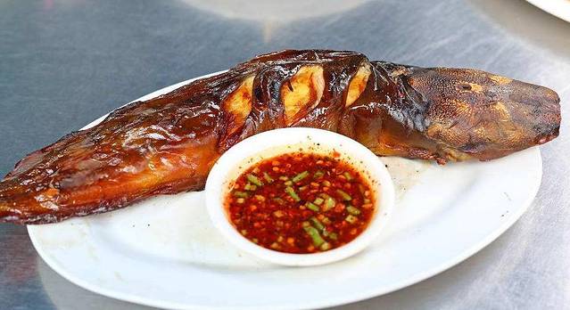 不是国内那种一个大铁盘子用水煮着的油炸过的鱼,而是真正在炭火上烤的鱼。泰国人真的很喜欢烤东西,香蕉、香肠、海鲜、鸡蛋、啥都能放在架子上烤起来,但是这个看起来黑乎乎的烤鱼,居然是真的超!好!吃!