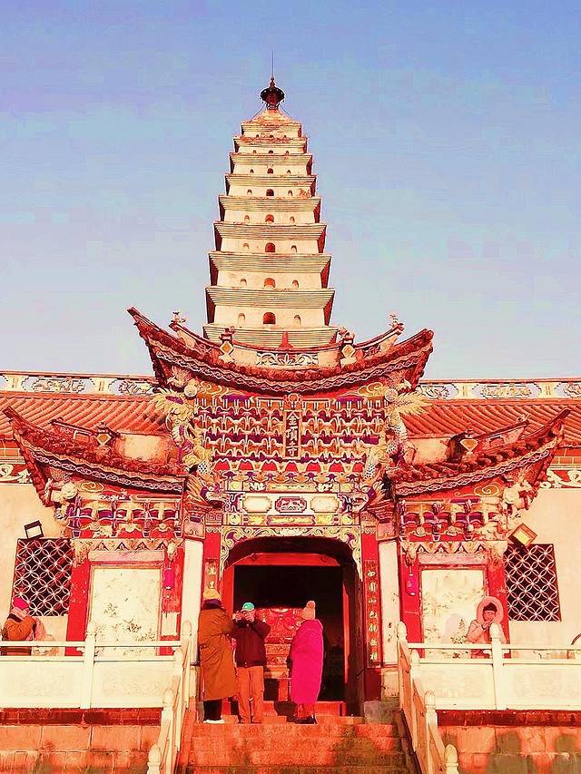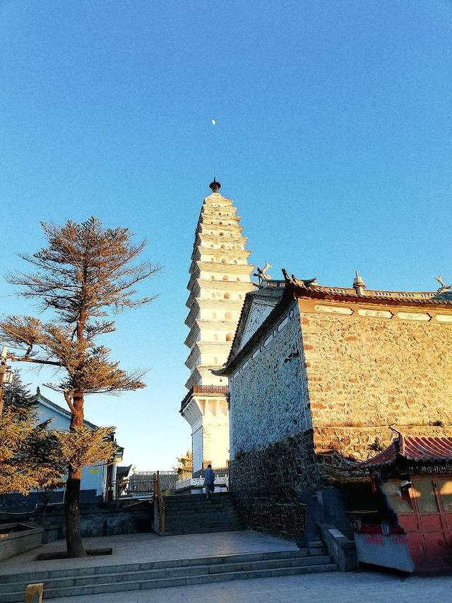 喇叭金顶寺看日落最好的视角是在大殿西侧,冬天的日落时间大概6:30左右,具体记不清了。日落之前也能拍到天上的月亮,最好的拍摄地点是大雄宝殿前广场东侧,找好角度月亮,楞严塔尖在一条线上。日落的时间非常短,也就5分钟吧!然后天就全黑了,记得带照明手电,不然要开手机手电筒,寺院里面没有路灯晚上特别黑。