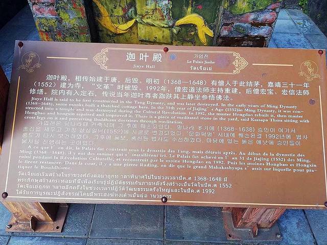 走上一段特别陡峭的台阶上面是迦叶殿,也叫迦裟殿,始建于明朝,现建筑是1994年重建。传说鸡足山的开山祖师饮光佛迦叶尊者在殿内的大盘石上守衣入定500年,因此得名。大盘石具体位置在寺院西北角,沿台阶往上走有非常大的一块石头,即是,也称盘陀石。大盘石旁上几节台阶是新建的“露天禅室”,有莲花座30个。迦叶殿因为有盘陀石,所以鸡足山占有举足轻重的地位,被称为“山中第一寺”和“山中诸寺之祖庭”。