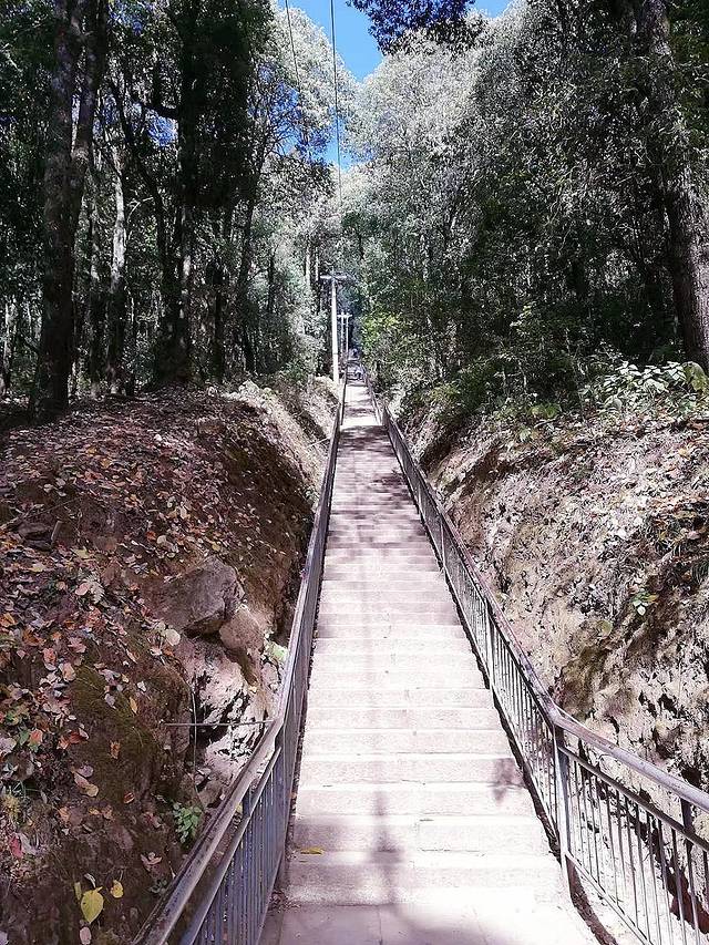 穿过猴区一定要小心,猴子会在树上跳来跳去的,地上的也会找你要吃的,把东西都放包里,手里最好不拿东西。穿过猴群可以选择坐小巴或者步行到索道上站。想骑马的从香会街出来靠右走,马道跟游客路线不在一起。登山步道是这样的,如下图。这段路坡度不大,而且两边的植物非常茂盛,体力跟时间允许的情况下可以走一走。
