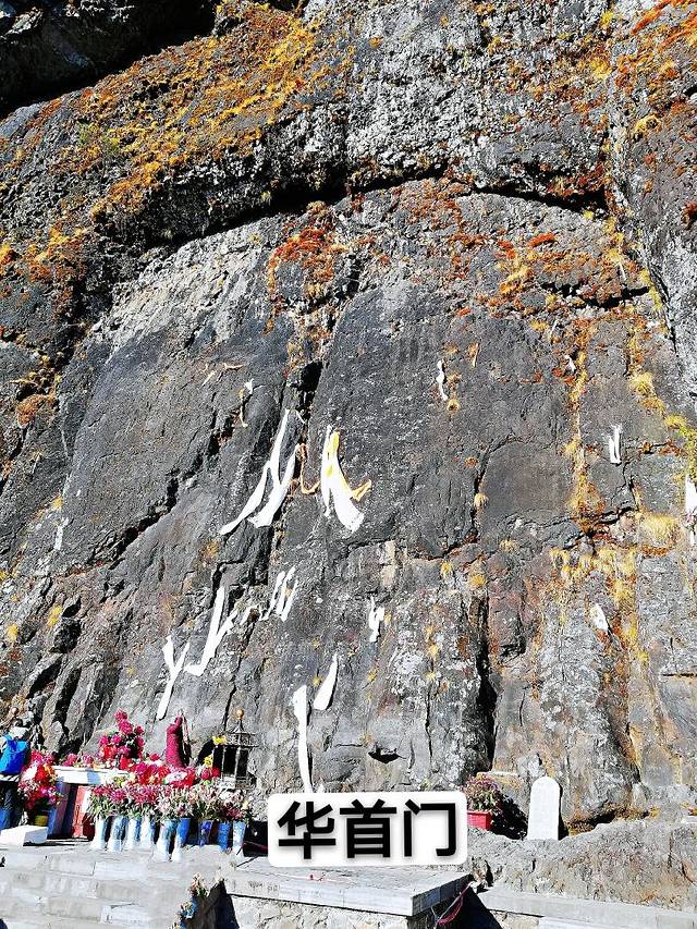 往前走就是华首门。一座天然石壁,犹如一座石门。高约四十米,上方犹如拱形门框,一道垂直下裂的石缝把石门分为两扇。华首门——迦叶尊者入定的地方。不知这些要归功于大自然的鬼斧神工,还是要归功于迦叶尊者的愿力加持。