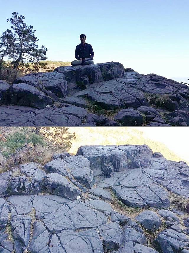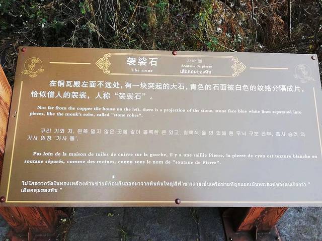 据住宿的老板说华首门有一条路直通金顶寺,可以我没有找到,只能原路返回,路过铜瓦殿,铜瓦殿左侧看看袈裟石,上面有个小哥哥在打坐,偷偷拍下来赶快走人鬼脸鬼脸鬼脸。