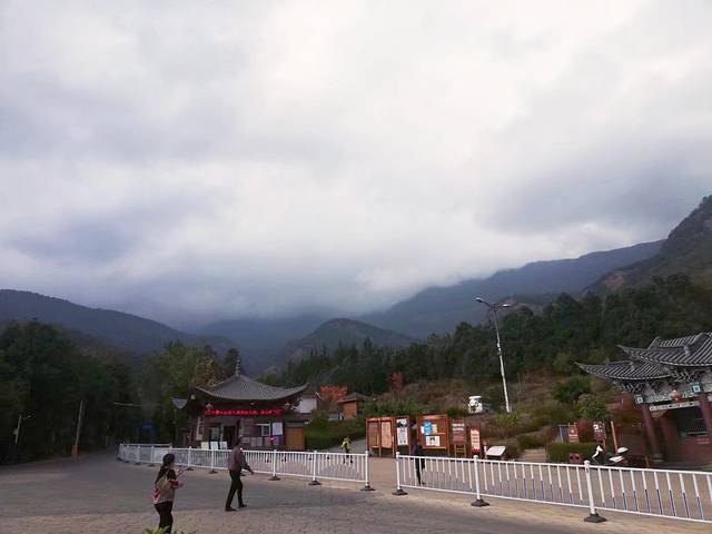 大巴车终点是鸡足山祝圣寺香客街,路过山门会停车,下来买票,可以在这里拍照,我去的时候天气还可以,回过头看看山里阴沉沉的,也不知道里面会不会下雨,山里的天气跟外面从来就是两回事。再次上车检了票,直奔香客街。