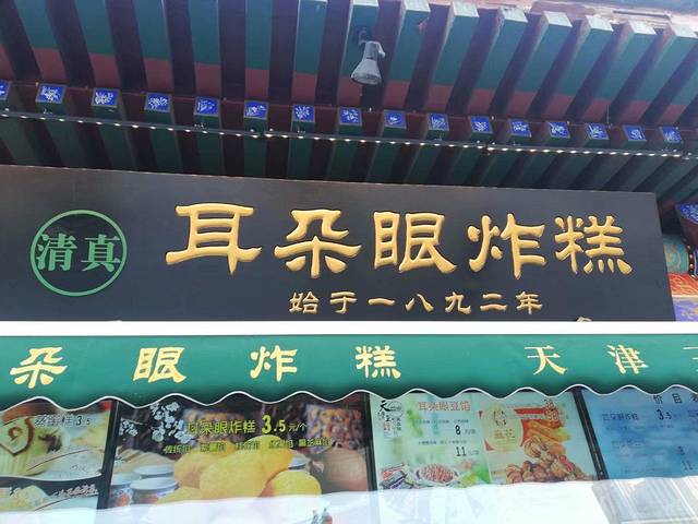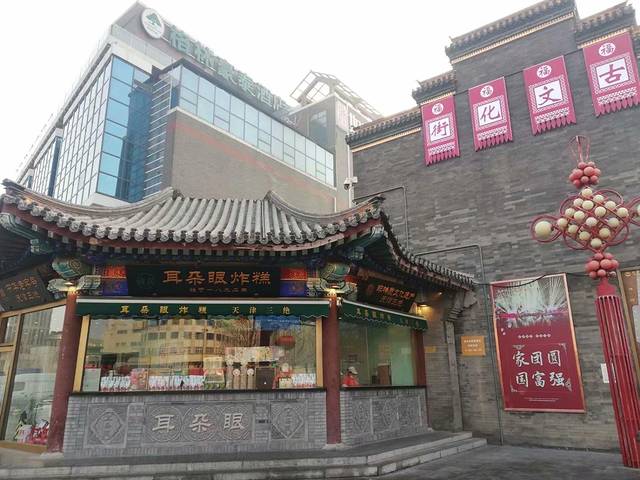 有聪明的商家在古文化街北门左手边开了一家耳朵眼炸糕连锁店。耳朵眼炸糕,天津小吃三绝之一。天津人喜欢的早点之一。除了早上趁热吃,平时饿了,吃一个垫垫,也算天津的一种小吃。外表金黄酥脆,里面软糯香甜,豆沙馅不光甜还有桂花的香。天津卖的炸糕非常多,有店铺窗口,有小门脸,也有推三轮车售卖的。