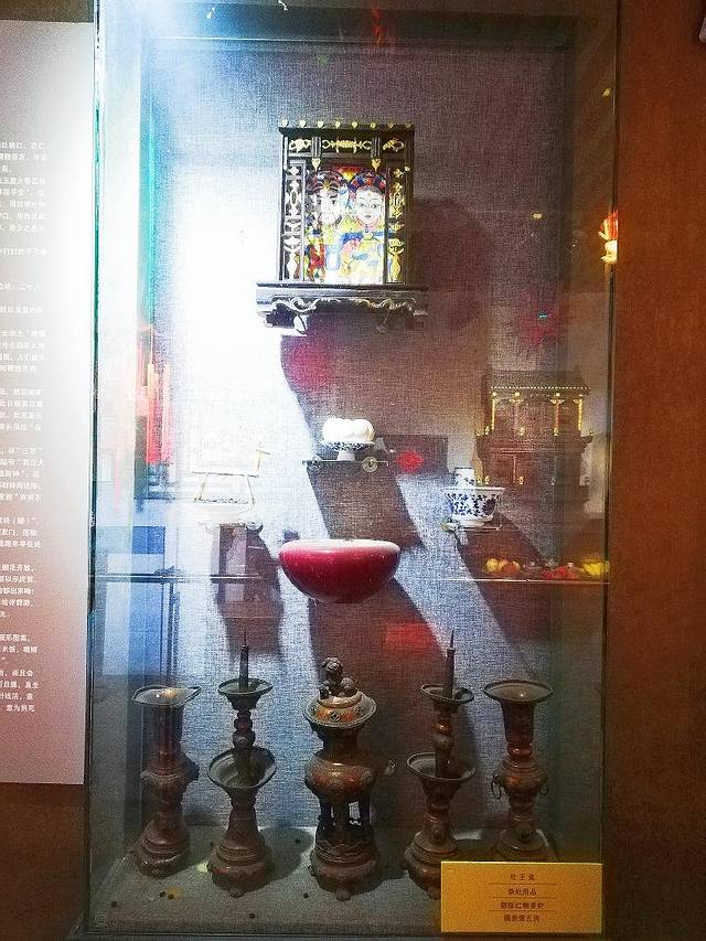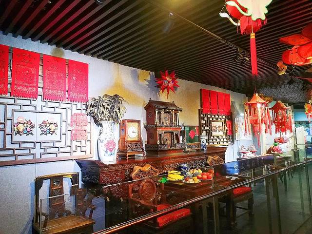 爱心民俗博物馆里老式的摆设,条案,屏风,帽桶,鸡毛掸子,座钟,八仙桌子摆着时令水果和点心。