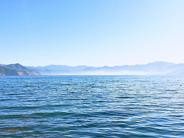 樱花大落水村前往三家村方向,沿湖路,远处被白色雾气包裹的就是王妃岛所在地,泸沽湖有名的网红照雾锁王妃就是这里拍的,没带专业相机,凑合看看吧!