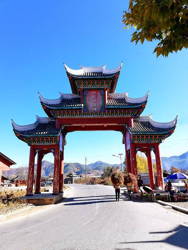 骑过三义村就没有沿湖路了,蒗放村骑行路线是023乡道。继续直行,右手边立着界石,堆着祈福的玛尼堆,周围还装饰了猪槽船,这里是滇川友谊桥所在地,过了牌楼就从云南省地界进入四川省——盐源地界了剪刀手
