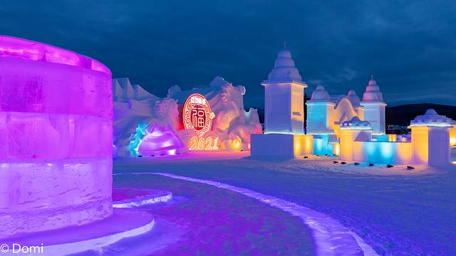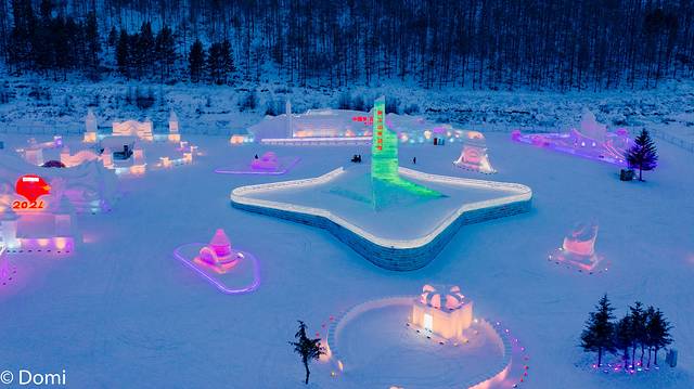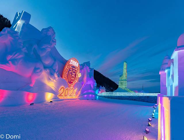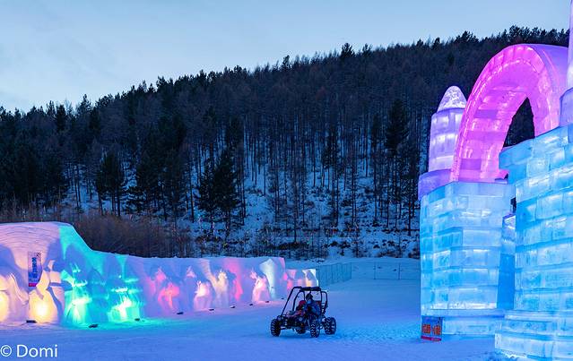 夜幕降临,霓虹亮起,里面的冰雕、雪雕在灯光的渲染下特别美丽,与阿尔山的小城景色相得益彰,组成了一个完全原生态的冰雪世界。