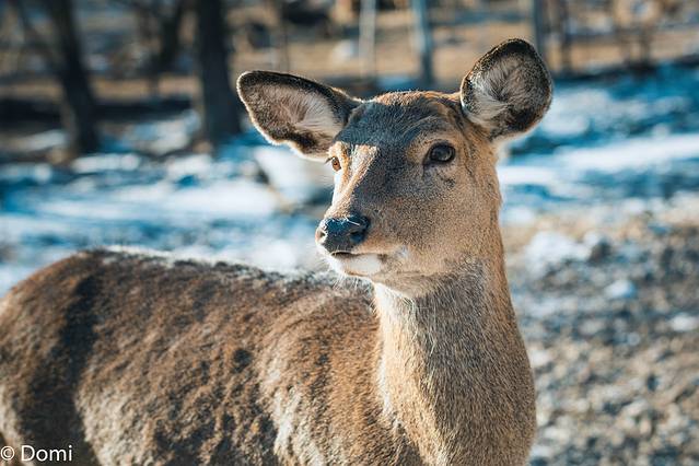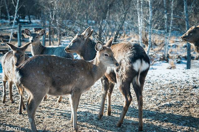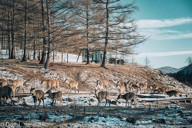 午餐之后来到鹿村,也是亲爱的客栈的拍摄地儿,这里面有上百头梅花鹿,夏天的时候身上的有明显的梅花鹿斑点,到了冬天他们也穿上了厚厚的绒毛,斑点就隐藏起来了。