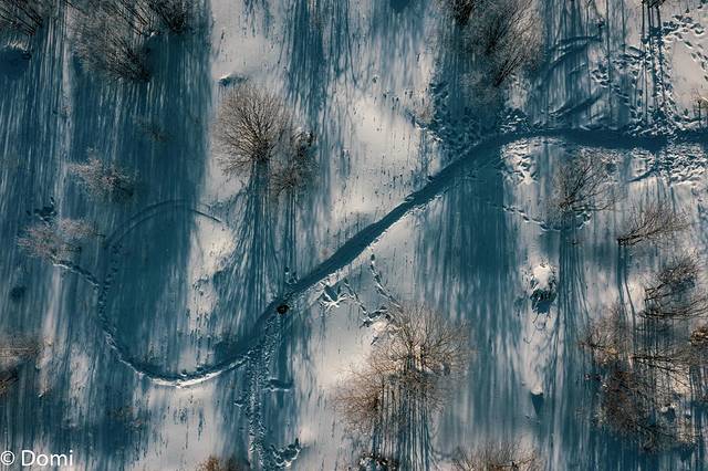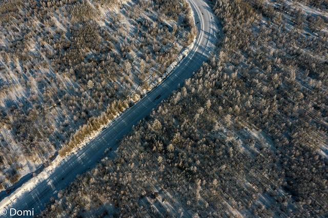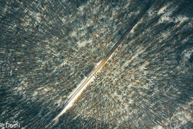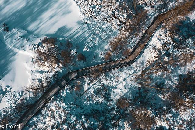 这个雪道是雾凇长廊,从马路边可以直接下去,偶尔会有两三个游客的身影出现在航拍的镜头里,也给画面增添生动感。