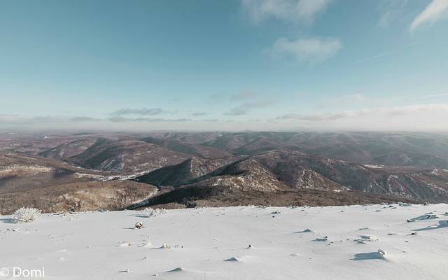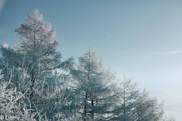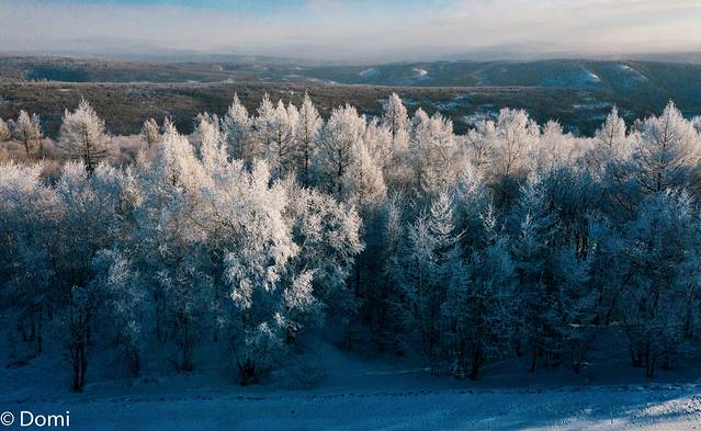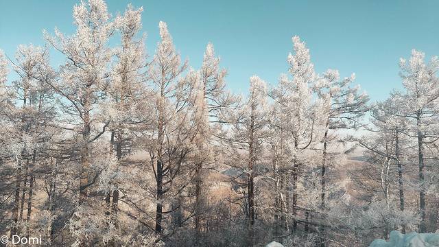 兴安敖包的海拔1400多米,比阿尔山市区要高几百米,也因为海拔和气压等因素这附近的雾凇才如此丰富,挂满冰霜的树枝上在蓝天月阳光的映衬下格外洁白……