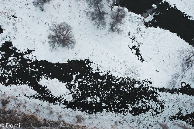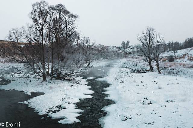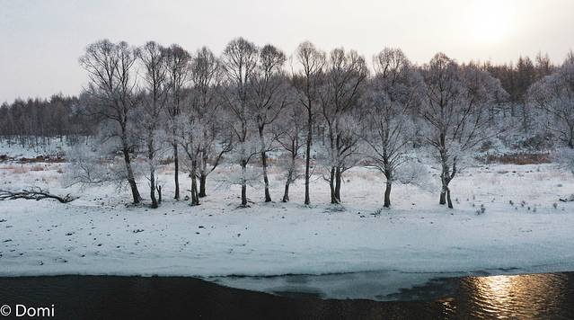 升腾的雾气遇到树枝就凝结成了雾凇,形成了冬天独特的景观,裸露在河面的石头也时常有冰雪堆积,一个个蓬起的小雪蘑菇纹丝不动的待在缓缓流淌的水面上……