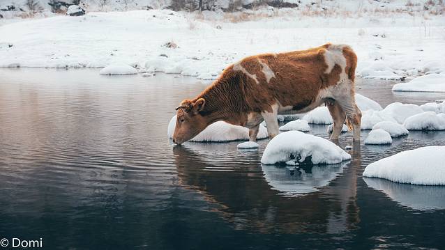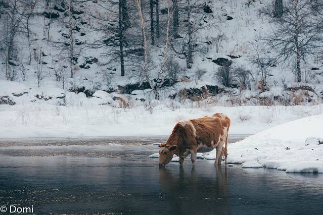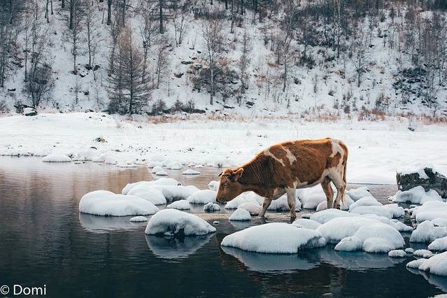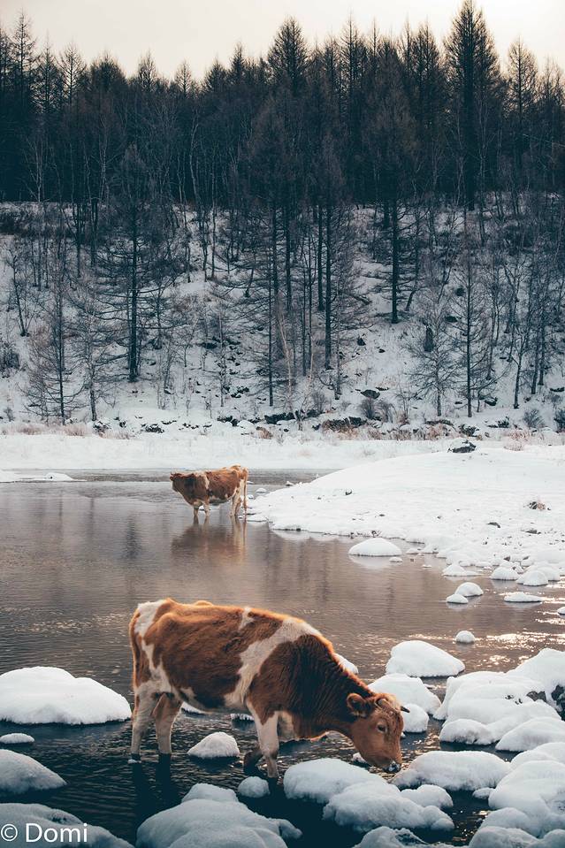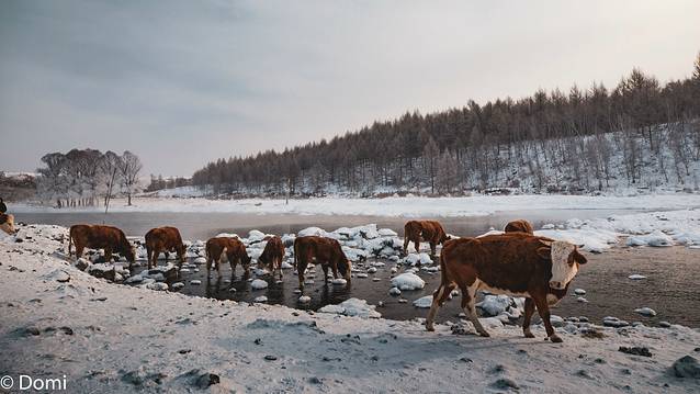 热气腾腾的水雾飘在河面上,一波又一波的黄牛过来饮水,吃草【当地人称作“发菜”在不冻河里生长的水草】然后再沿着自己的行走轨迹回去……