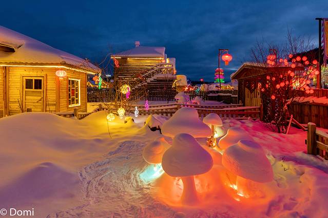 里面建设的场所特别齐全,光是餐饮就有许多不同的类型,俄式西餐、雪村炖菜等,每家店门口的雪蘑菇以及树上灯饰挂件看着特别有气氛!