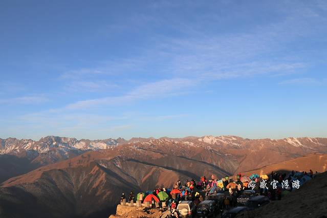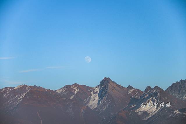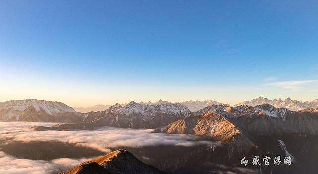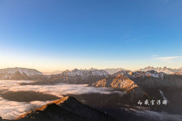 360度无死角的欣赏四面的美景,北面的四姑娘山,南面的帕格拉神山,西面的贡嘎雪山。17时55分开始等待日落到18时33分太阳完全落下,日落的光照着云海雪山真的好美,不过手脚也被冻僵,虽然全副武装,羽绒服、雪地靴、围巾、帽子,也挡不住寒气 。