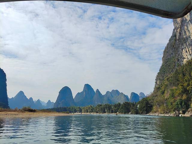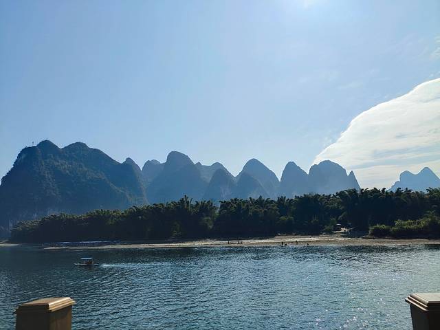 从岩洞内出来就直奔漓江也就是20元背景图上的地方,漓江的风景真的是很美,坐漓江的竹筏感受大自然的风光,一个竹筏是4人位,工作人员会帮助拼伐,如果不想拼就要补空位费,一个空位好像是35,坐在竹筏上感受两岸的山峰层峦叠嶂,黄布倒影等景色,漓江是最值得推荐的地方。