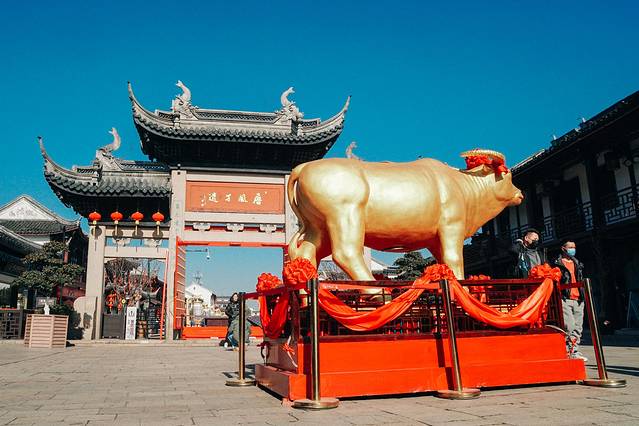 今年是牛年,周庄也在入口处放了一只巨大的金牛迎接客人,关于这个金牛,也流传着这样一个说法:“一摸春牛头,福气自来投,二摸春牛腰,钱财就上腰,三摸春牛尾,福寿不见尾“,路过的客人也都开心的抚摸着这只大金牛,这一切也预示着周庄的财运年即将开始。