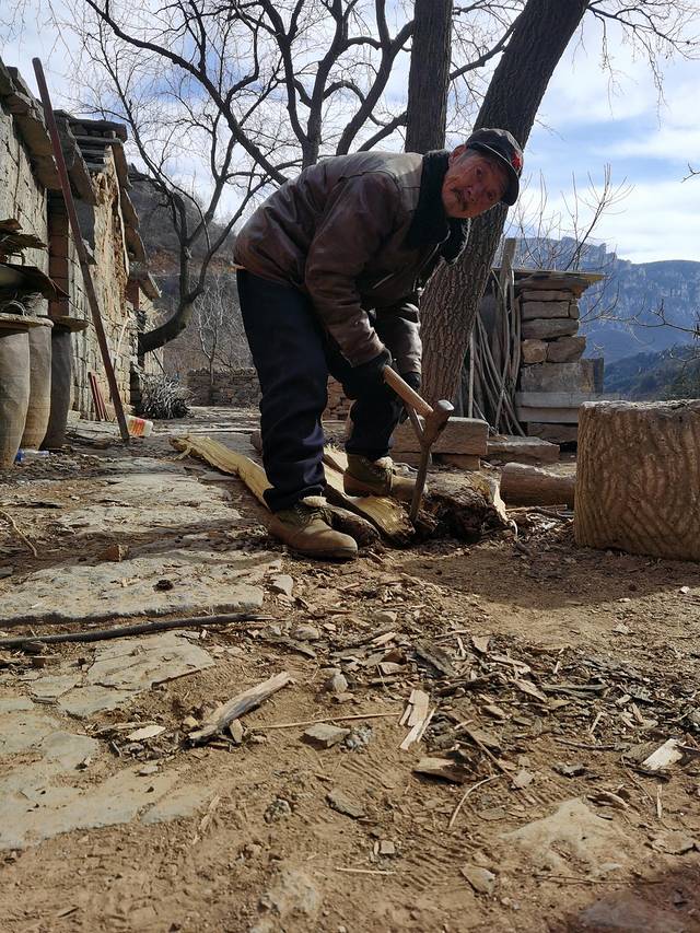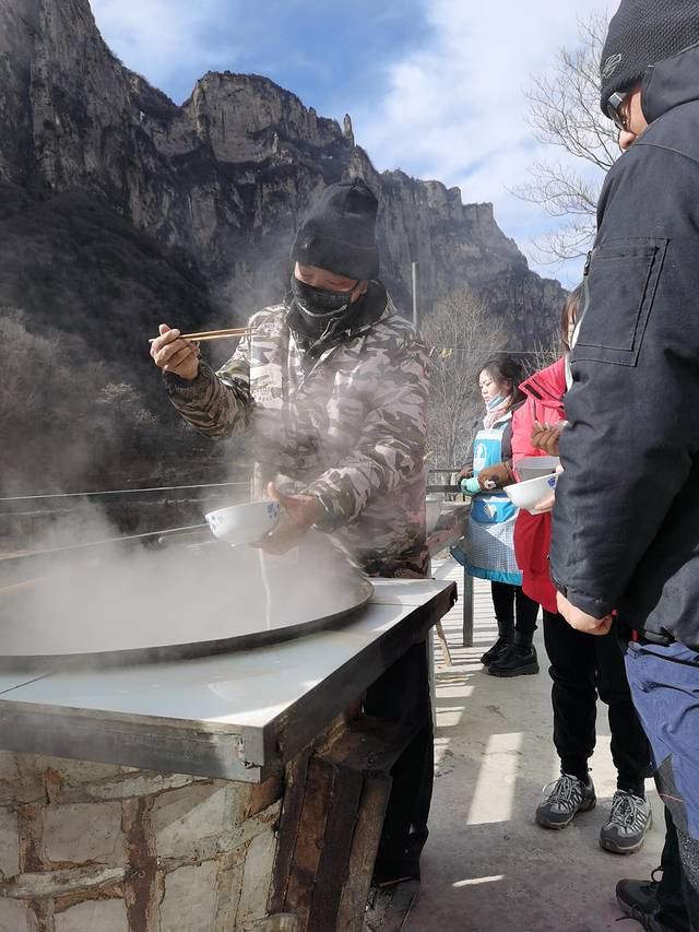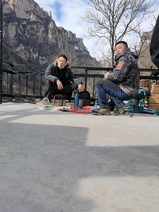 在中午的十二点左右,还没有抵达中午吃饭的农家的时候,不远处早已经看到了袅袅炊烟,门口大爷正在劈柴为我们的午餐加大火力。到达的农家小伙伴们迅速地卸下自己的行囊,“摩拳擦掌”准备大干一场,早早地拿着碗筷排着队准备开饭,自备路餐的两位小伙子早已经搭好了锅,准备着他们今天的火锅大餐。