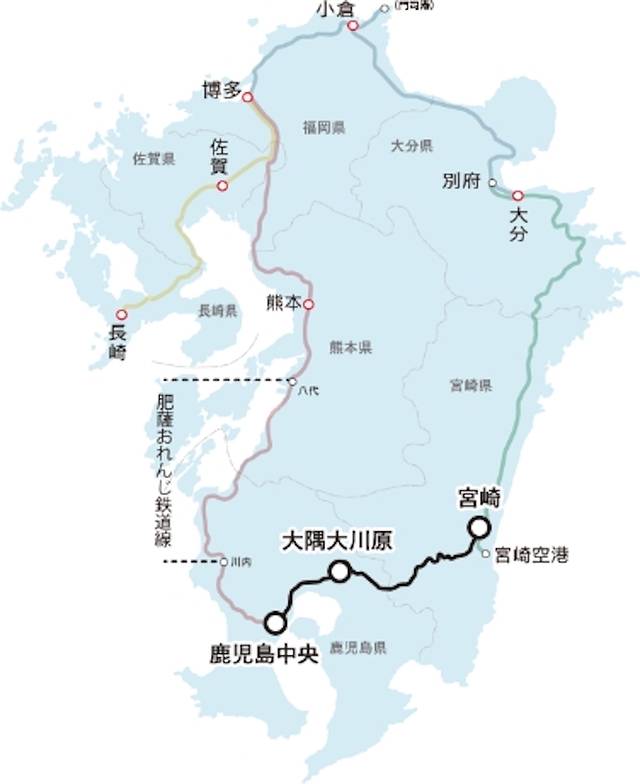 鹿儿岛中央站 12:16开 - 13:20左右在大隅大川原站稍作停顿(停车近50分钟) - 12:30左右是午餐时间(包厢、普通座席) - 15:00左右在青井岳站临时停车(停车近10分钟) - 宫崎站15:57达
