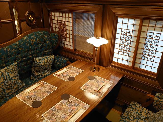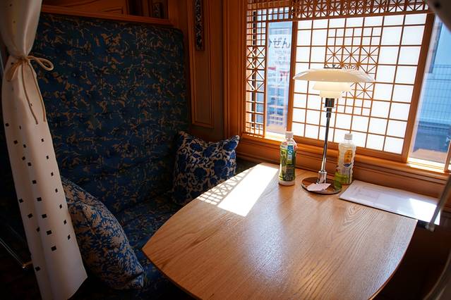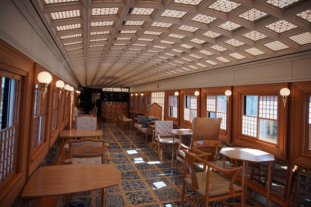 车内处处透露出典型的日式风情,有自然浑成之感。各车厢使用的木质互不相同,特点鲜明。